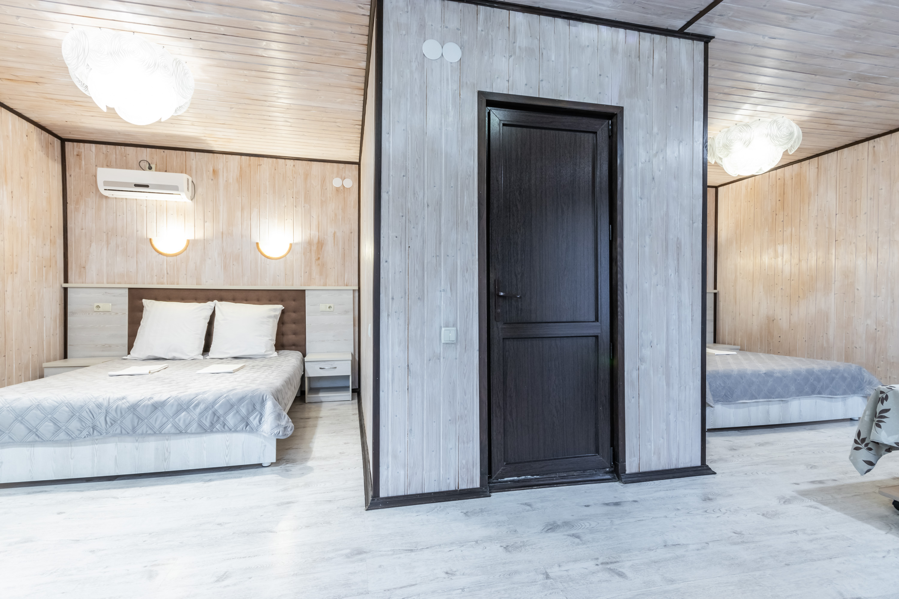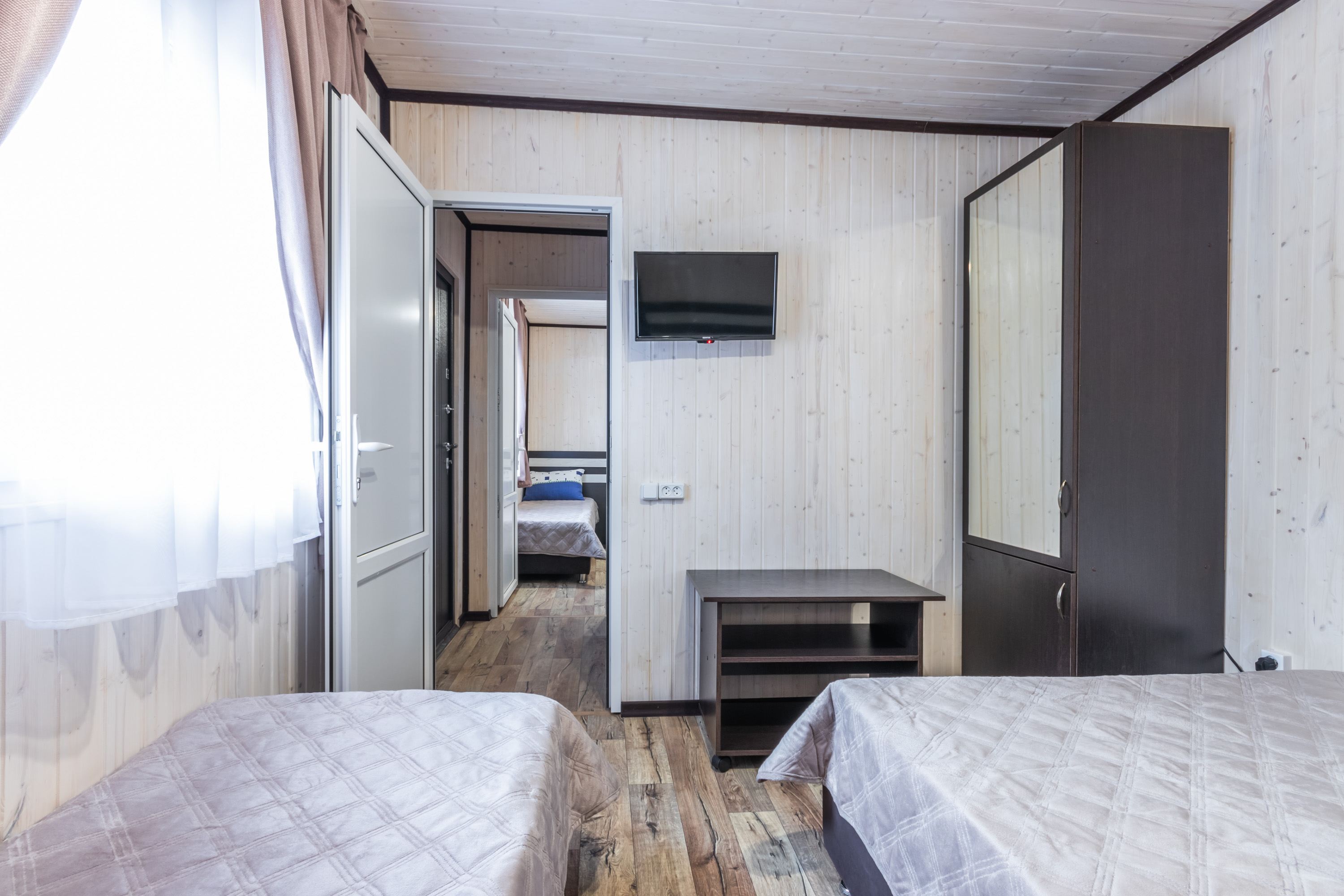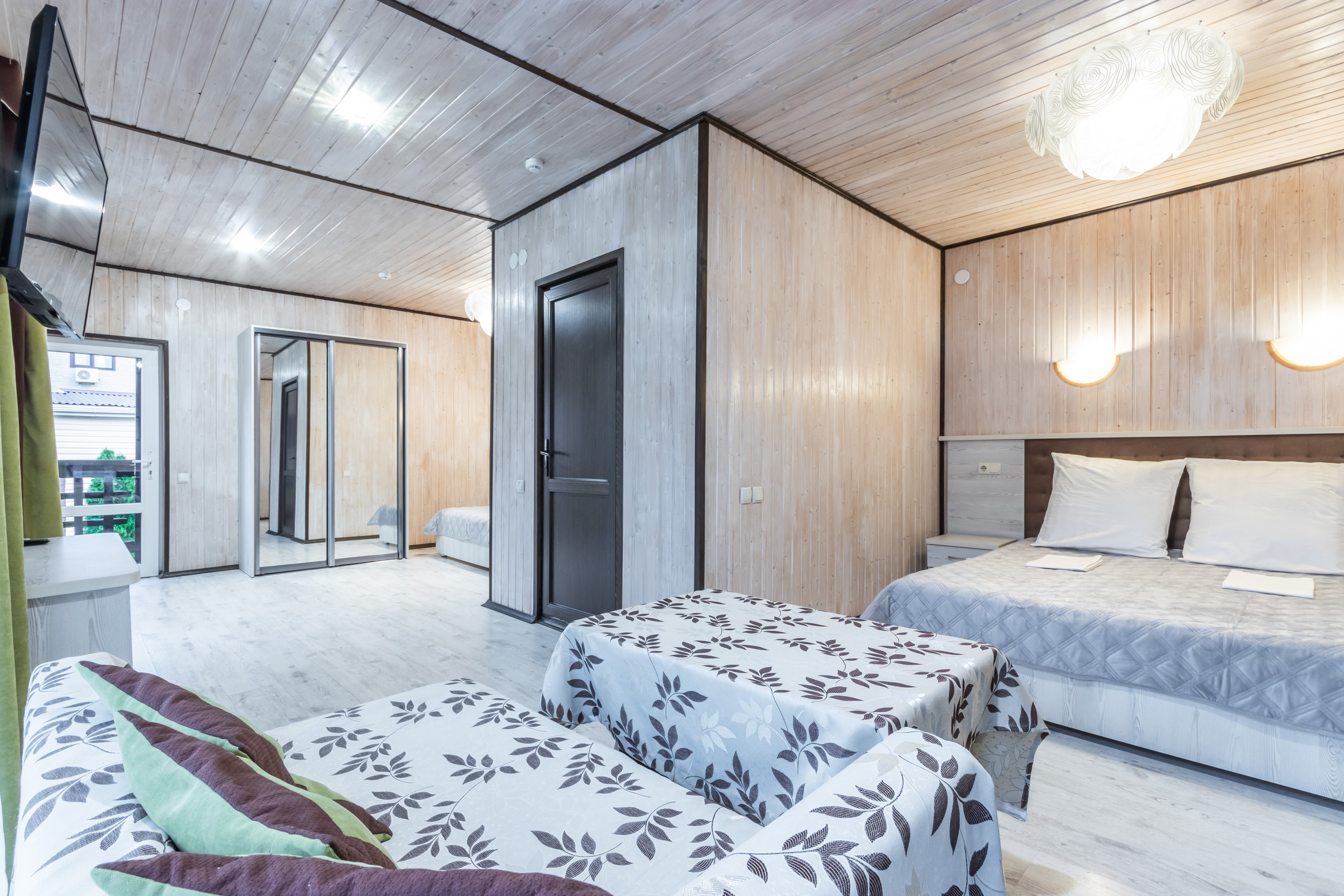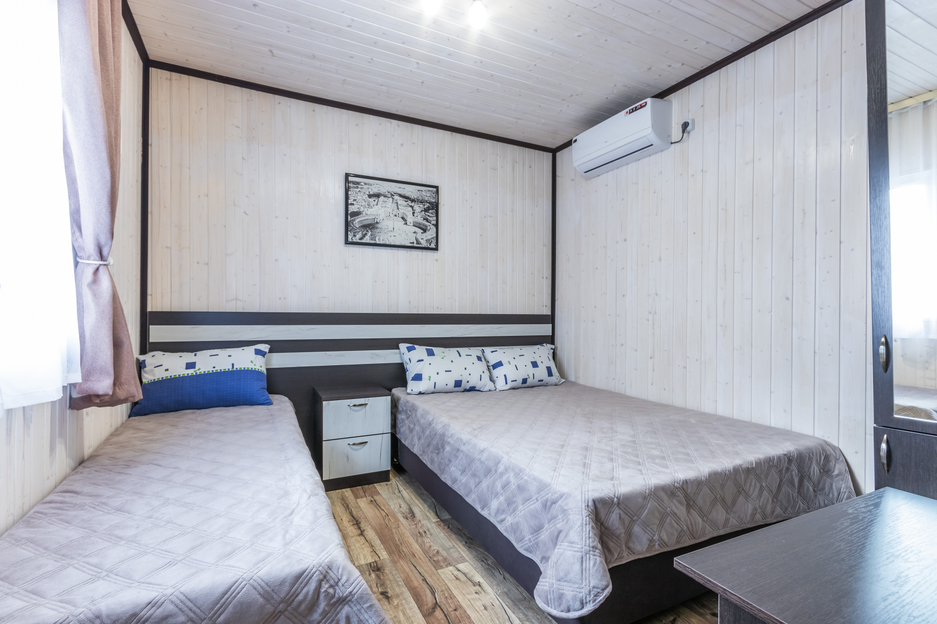 - Мебель: зеркало, кровати односпальные, кровать двуспальная, прикроватные тумбочки, тумба, шкаф