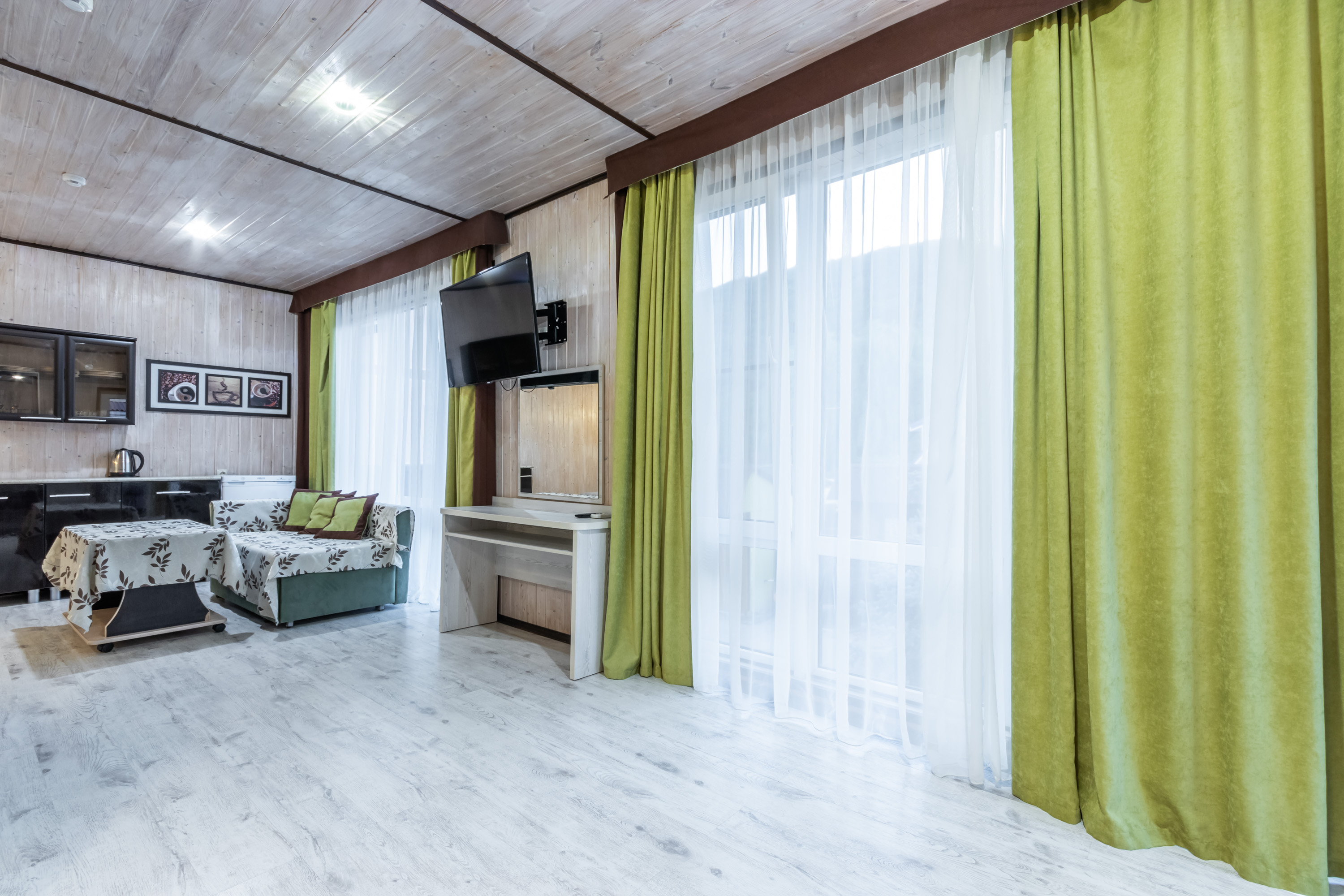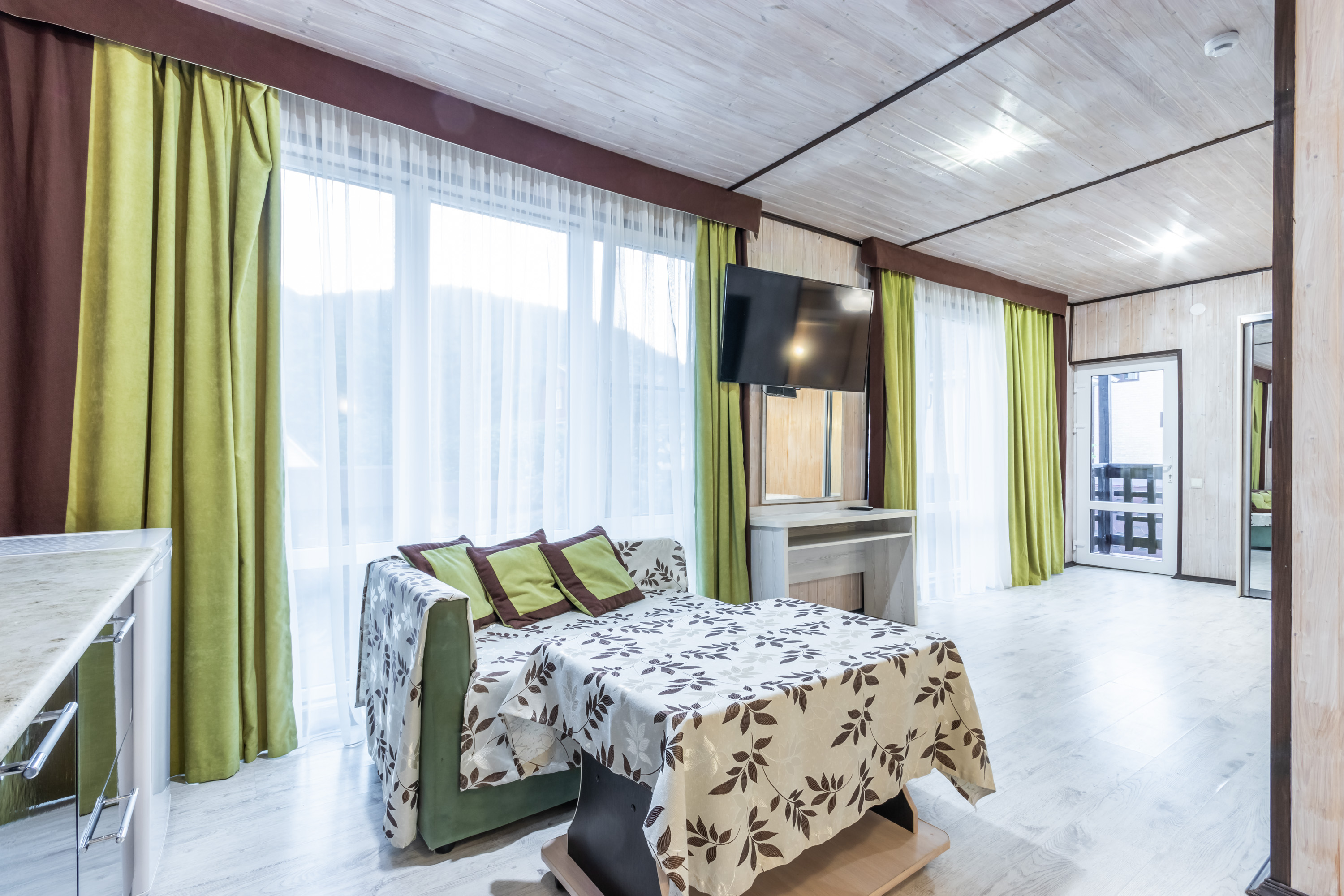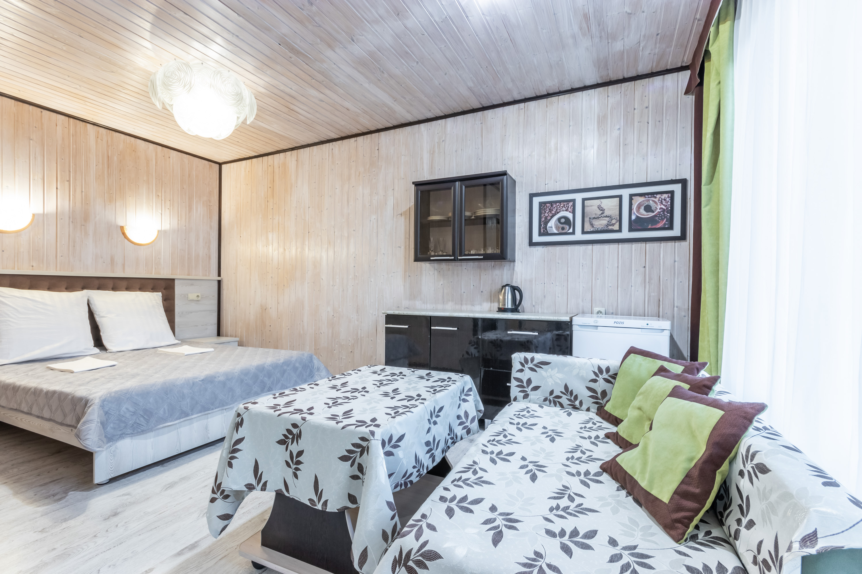 | Комфорт 5-местный | 30 кв.м. | 5 чел. | Мебель (диван раскладной, зеркало, кровать двуспальная, кровать односпальная, кухонная мебель, прикр... | |
